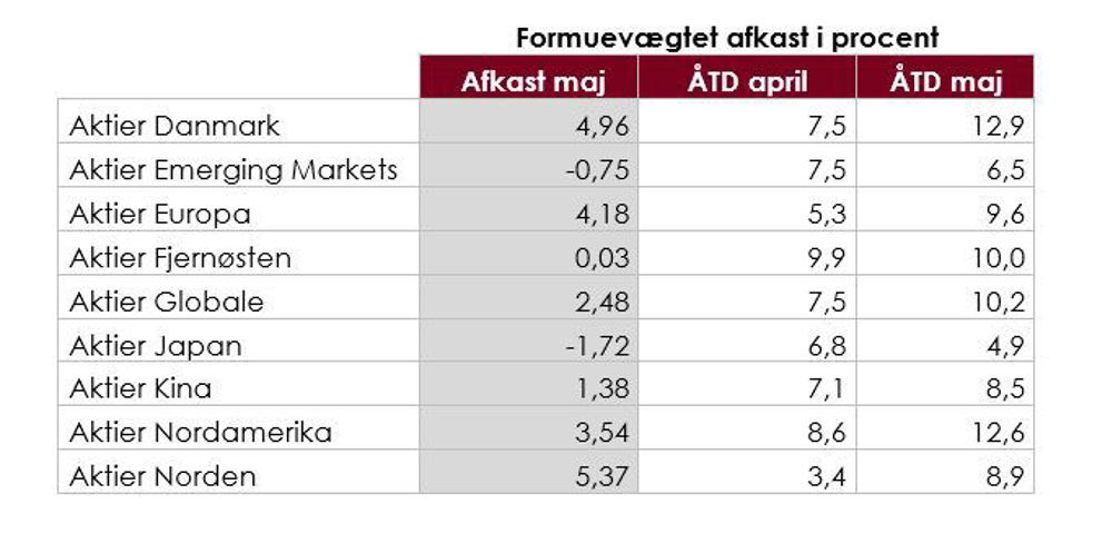 Det billede ændrer sig en del med afkastene for maj måned. Det ses mest tydeligt for fonde, der investerer i danske aktier. Med et afkast i maj på 5,0 % stryger disse fonde til tops blandt alle kategorier af aktiefonde og lander på et år-til-dato afkast på 12,9 %. Den samme udvikling ses for fonde med fokus på nordamerikanske aktier, hvor afkastet i maj løfter år-til-dato afkastet fra 8,6 til 12,6 %. Fonde med fokus på nordiske aktier og europæiske aktier får med afkast for maj på henholdsvis 5,4 og 4,2 %. rettet op på år-til-dato afkastet, der dog stadig ligger under afkastene for globale og fjernøstlige aktier.