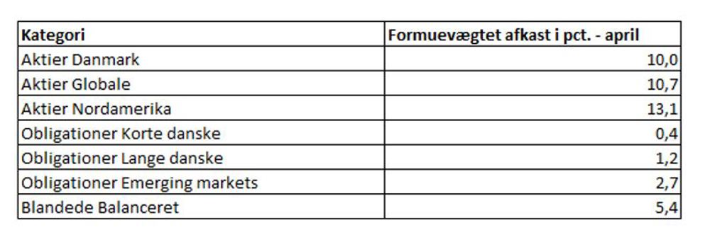 I april var det igen udenlandske aktier, og herunder især kategorien globale aktier, der tiltalte investorerne. Her blev der netto investeret mere end 4,6 mia. kr. Blandede fonde tiltrak også nye investeringsmidler, men på et lavere niveau end i de foregående måneder, da blandede fonde blot modtag godt en halv mia. kr. i nye midler mod knap 1,5 mia. kr. i marts.