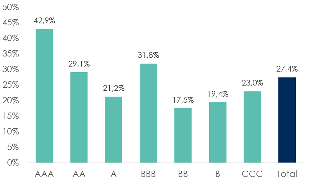 Analysen viser, at selskaber med gode ESG-egenskaber generelt klarede sig bedre end det generelle marked (”Total”), mens selskaber med lav ESG-score generelt klarede sig dårligere. Som eksempel fik selskaberne med den højest ESG-score AAA et gennemsnitligt afkast på 42,9 pct., se figuren. Resultatet stemmer med en tidligere undersøgelse fra oktober 2020, der viste en positiv indvirkning på afkastet, når en global aktieportefølje øger fokus på ESG.
