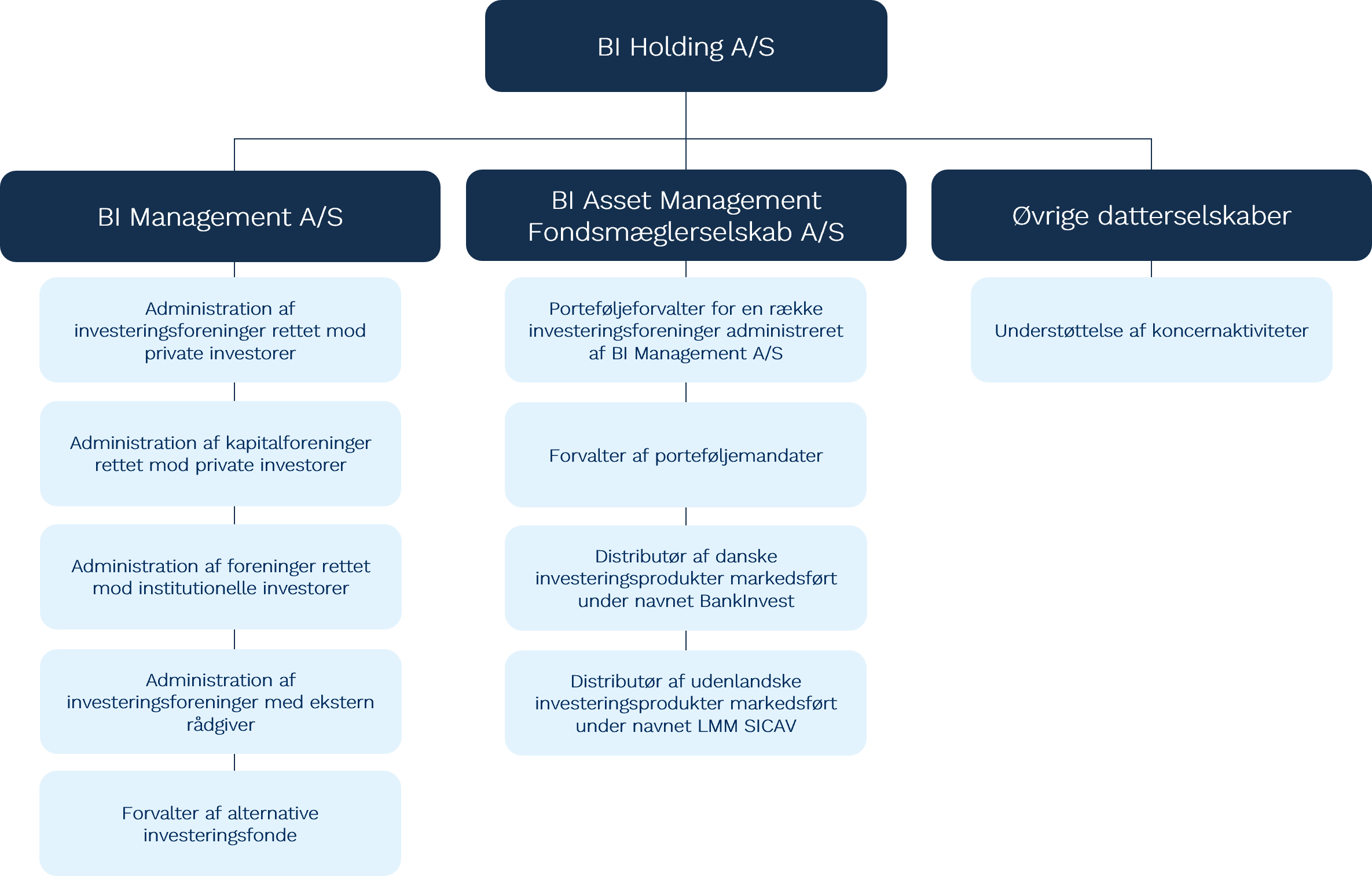 BankInvest-koncernen består af moderselskabet BI Holding A/S og de to væsentligste datterselskaber BI Asset Management Fondsmæglerselskab A/S og BI Management A/S. Herudover består koncernen af en række mindre selskaber.