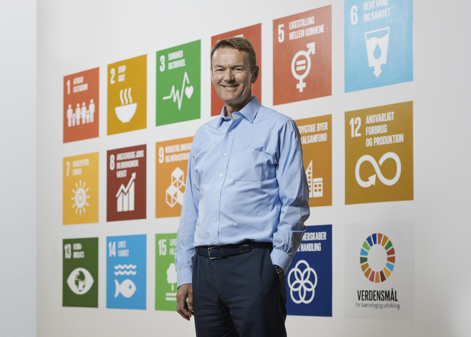BankInvest blev i 2019 godkendt som deltager (’participant’) i FN's Global Compact, der er verdens største initiativ til fremme af virksomheders samfundsansvar. BankInvest forpligter sig samtidig til også at arbejde for FN's 17 verdensmål. Lars Bo Bertram, daværende adm. direktør i BankInvest, er her fotograferet foran FN's 17 verdensmål, der prydede væggen i BankInvests reception i Nordhavnen.